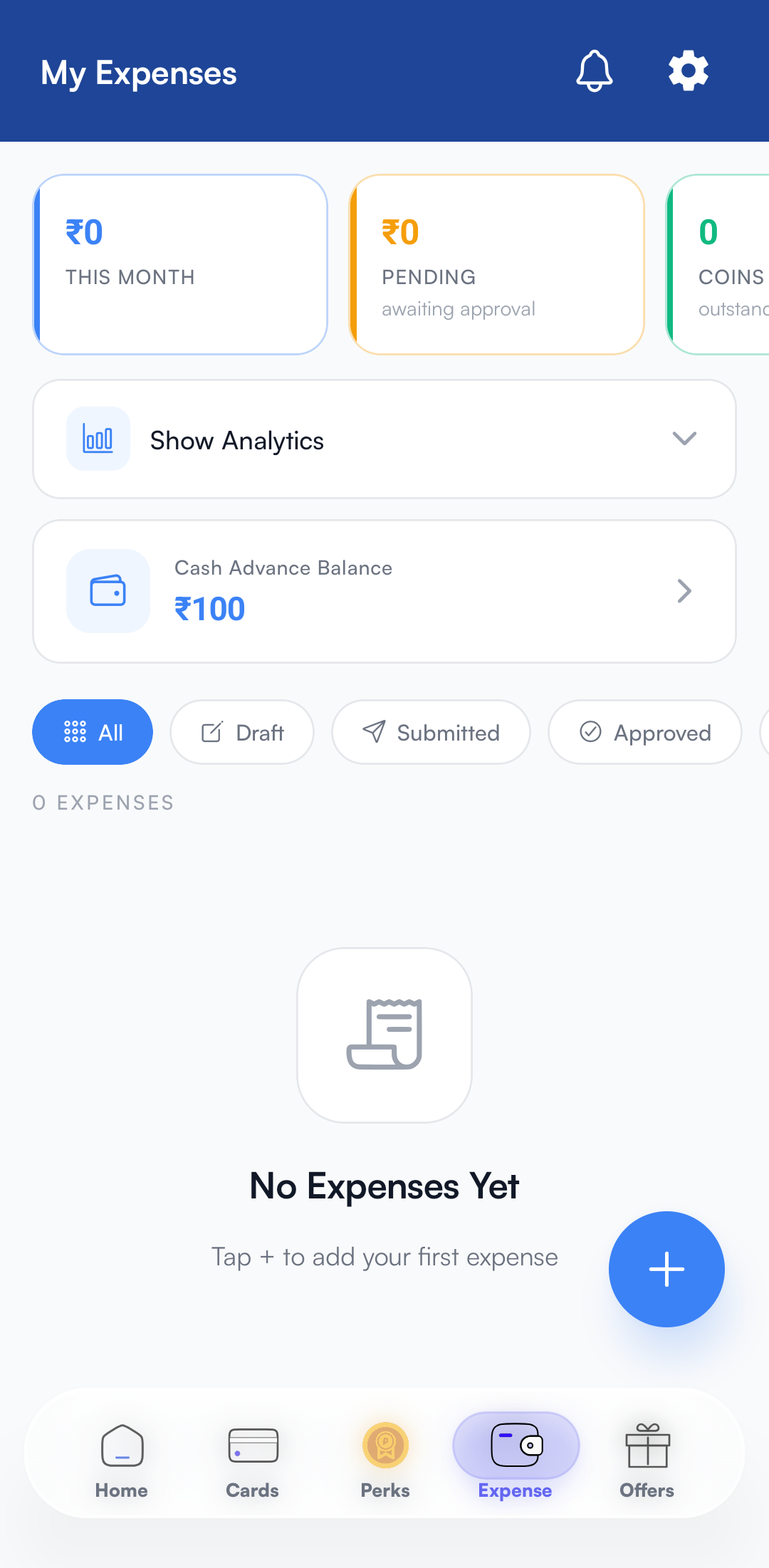 Expenses are business-related costs paid out-of-pocket that require reimbursement from your organization. Unlike PerksPe cards, these are personal funds you've spent on behalf of the company.